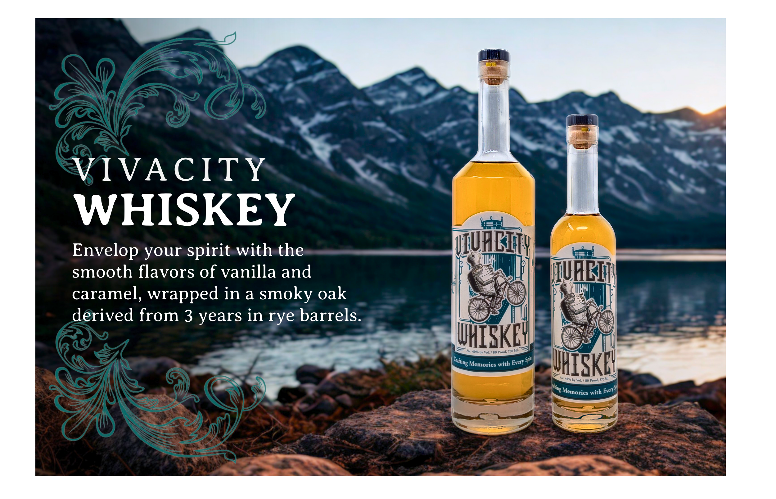 Inspired by good conversations sitting around a campfire, by a high mountain lake, Vivacity Spirits Whiskey’s smooth flavors will envelop your spirit with notes of vanilla and caramel wrapped in a smoky oak derived from 3 years in rye barrels.